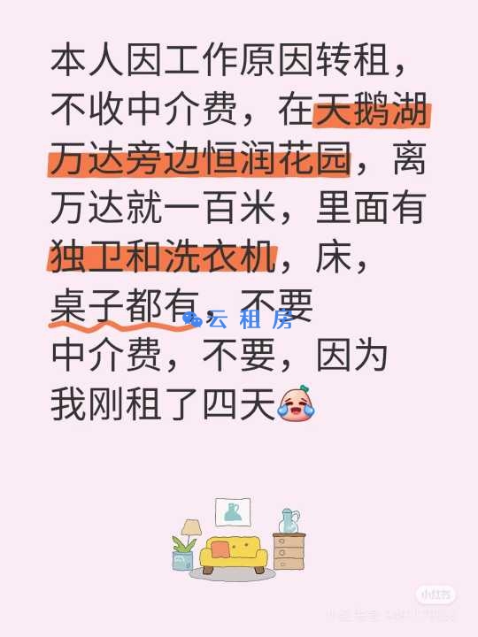 我是刚刚租的房子,刚租了五天,但是因为自己回家的原因,想把房子转租出去,就在天鹅湖万达旁边,独立卫浴,洗衣机全部都有,采光也特别好,孩子是真心想转租出去,因为孩子在合肥已经没有生活费了,想回家了