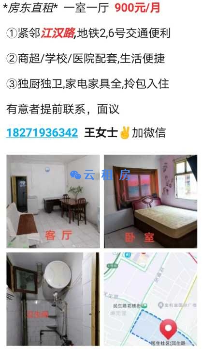 *房东直租* 江汉路地铁房 一室一厅,900元/月...