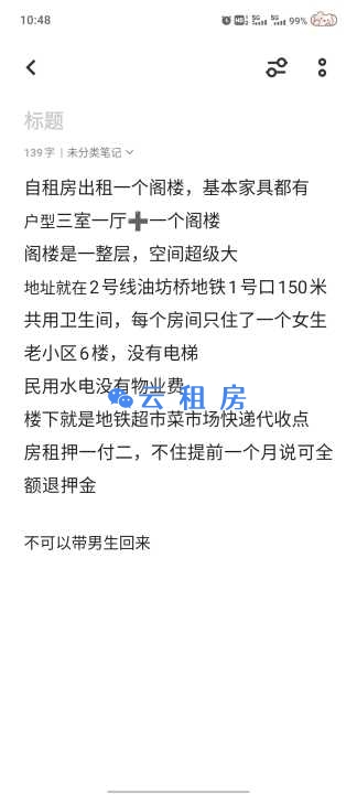 招女室友油坊桥地铁口,空出来一个空间超大的阁楼,老...