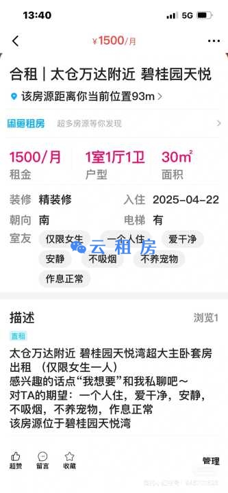 万达附近找室友,仅限女生哦!独立卫生间超大卧室飘窗...