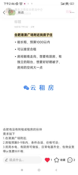 还在合肥找工作,暂时想短租,有一只猫,想整租一居室,如果找到离得近的工...