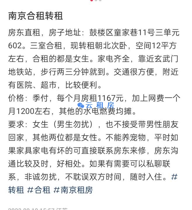 房东直租的房子,三室一厅,其他两个都是女生,不接受养宠物,不带异性回家...