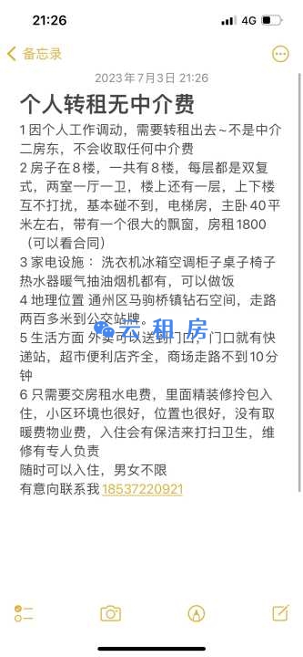 #租房 #转租随时看房 本人因工作调动,刚租好的房子不住了,位于马驹桥钻石...